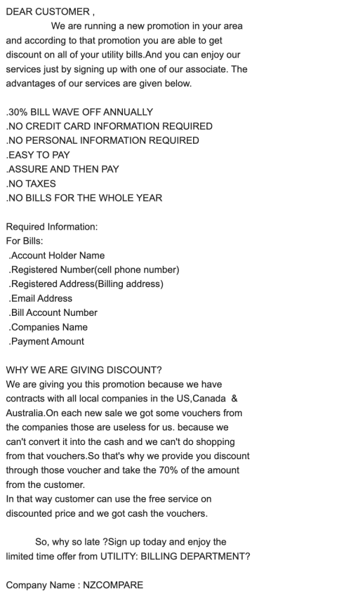 From the information we have received, the scammer is telling customers that they are running a promotion in which you will be able to get a discount off your utility bills. They ask for you to supply various personal details.